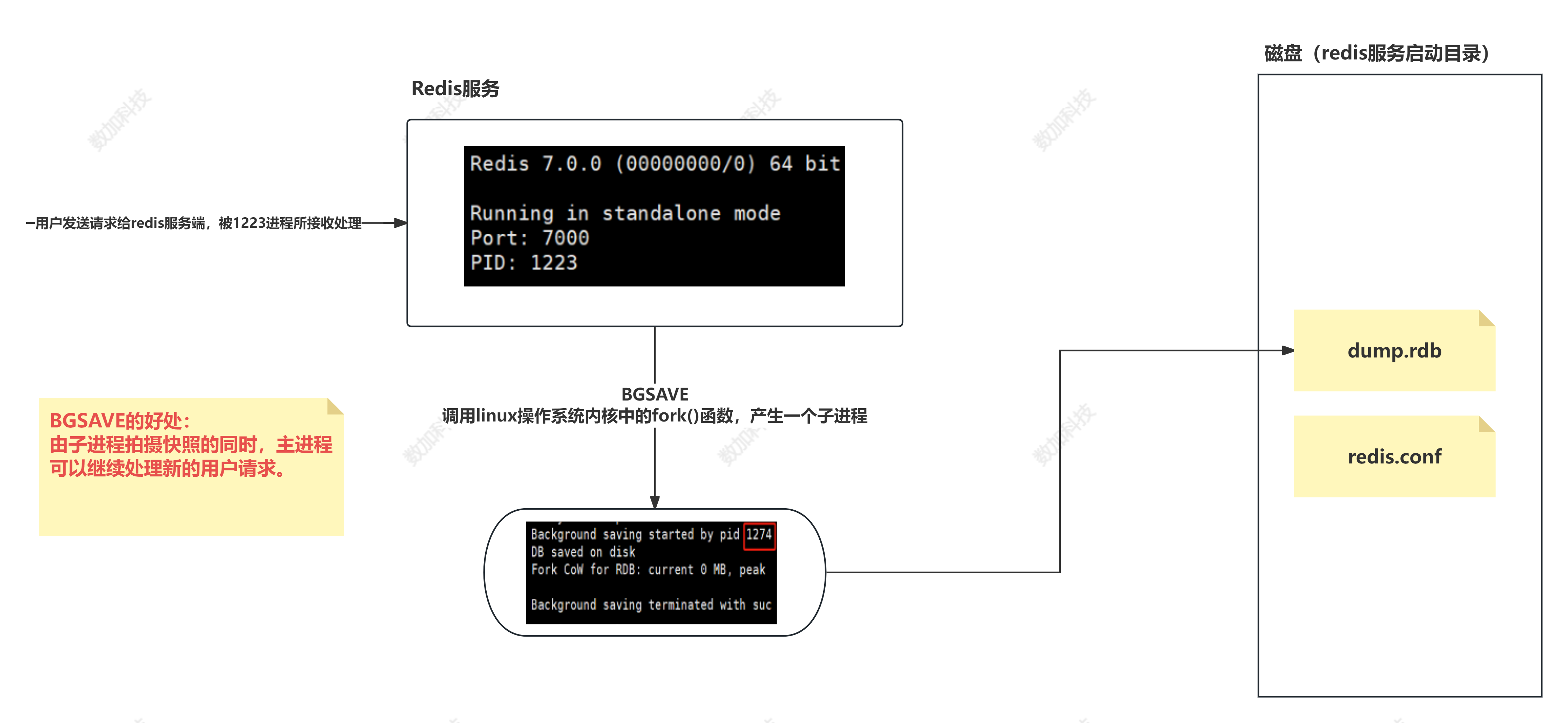 当接收到客户端的BGSAVE命令时,redis会调用fork¹来创建一个子进程,然后子进程负责将快照写入磁盘中,而父进程则继续处理命令请求