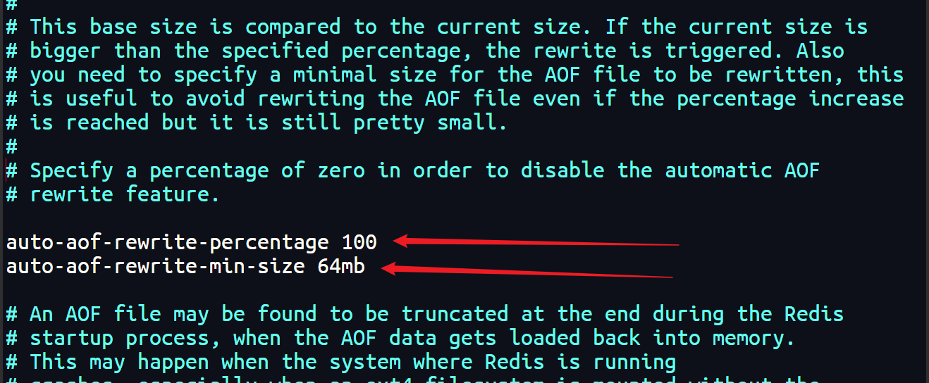 - 如果设置auto-aof-rewrite-percentage值为100和auto-aof-rewrite-min-size 64mb,并且启用的AOF持久化时,那么当AOF文件体积大于64mb,并且AOF文件的体积比上一次重写之后体积大了至少一倍(100%)时,会自动触发,如果重写过于频繁,用户可以考虑将auto-aof-rewrite-percentage设置为更大