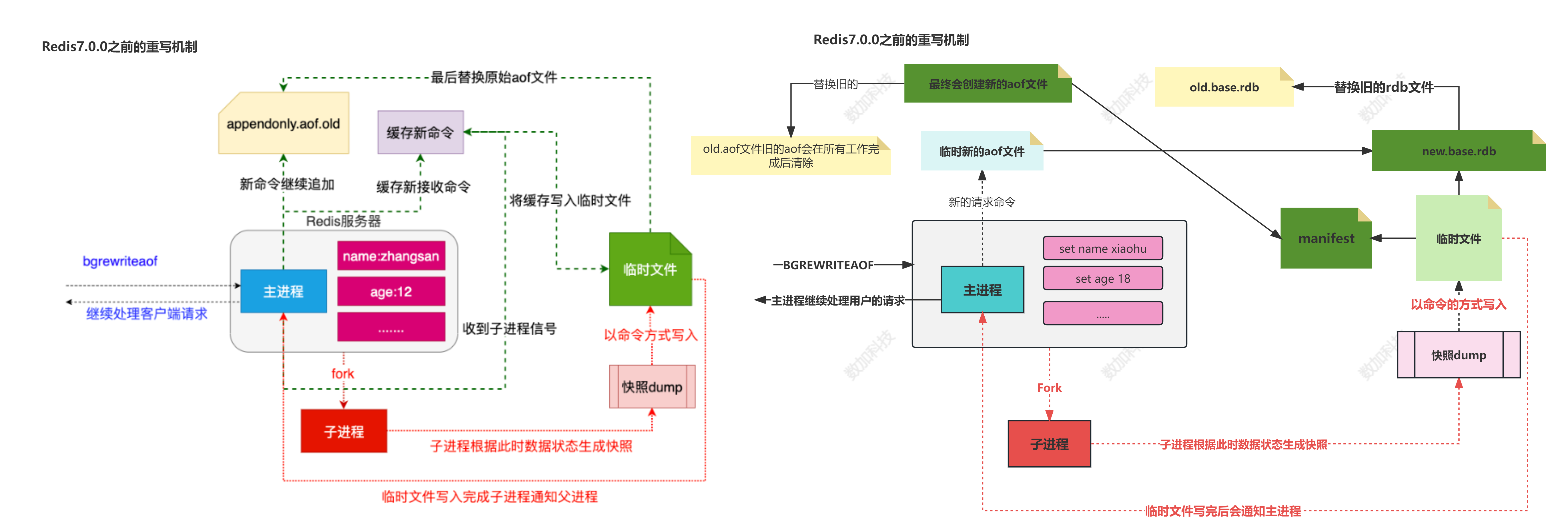 - 父进程继续处理client请求,除了把写命令写入到原来的aof文件中。同时把收到的写命令缓存起来。这样就能保证如果子进程重写失败的话并不会出问题。