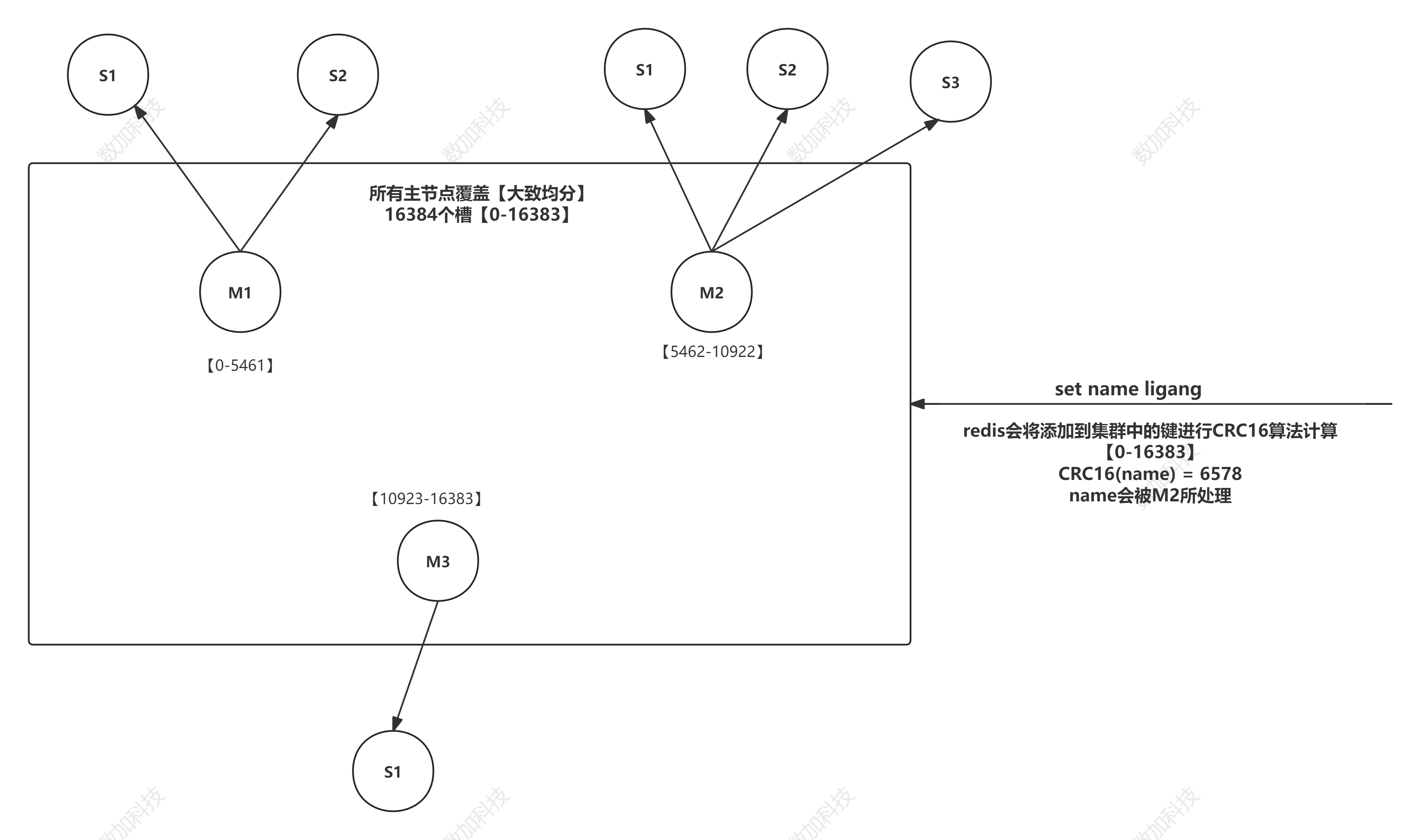 主节点存在hash slots,且主节点的hash slots 没有交叉