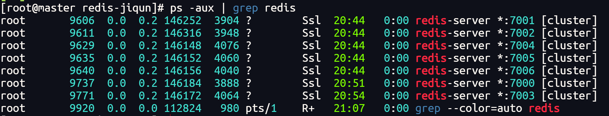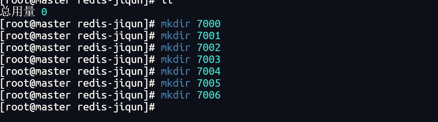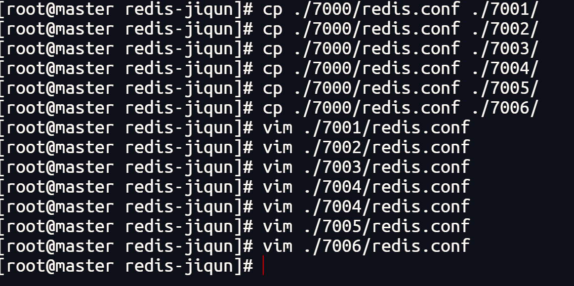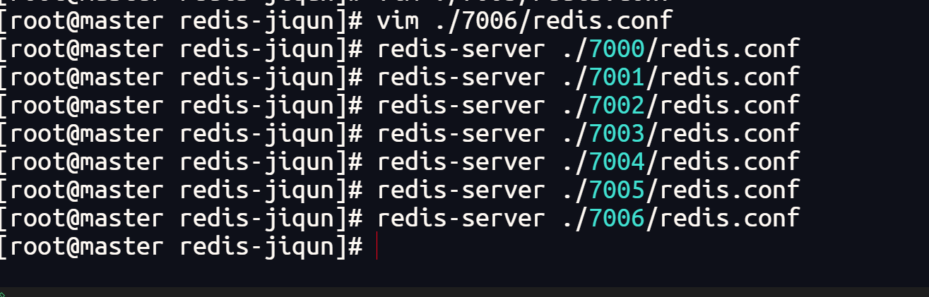 redis-cli --cluster create 192.168.6.101:7000 192.168.6.101:7001 192.168.6.101:7002 192.168.6.101:7003 192.168.6.101:7004 192.168.6.101:7005 --cluster-replicas 1
