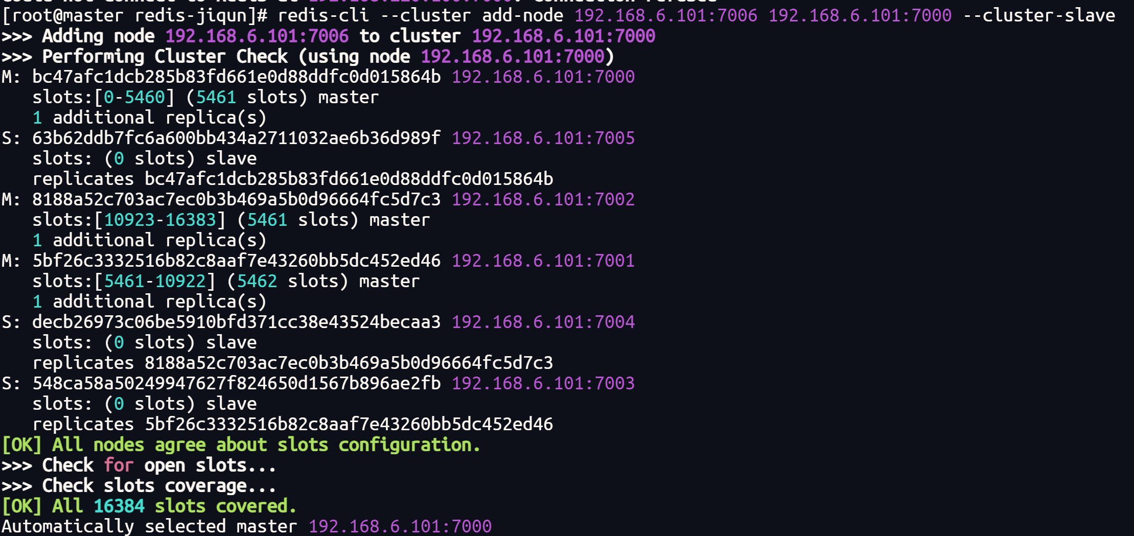 redis-cli --cluster add-node 192.168.6.101:7006 192.168.6.101:7000 --cluster-slave