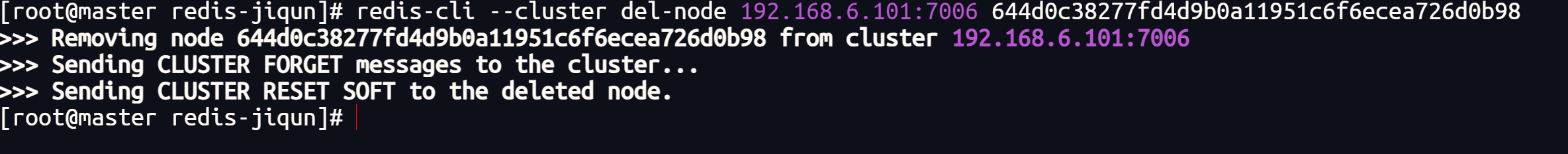 redis-cli --cluster del-node 192.168.6.101:7006 644d0c38277fd4d9b0a11951c6f6ecea726d0b98