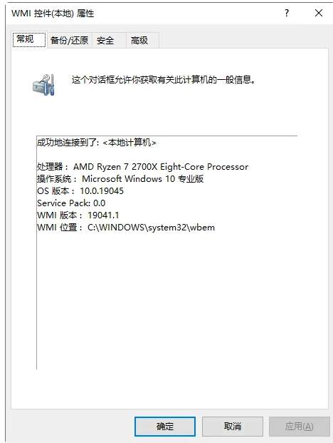 右键点击【WMI控件(本地)】,打开属性,若显示如下内容,则表示WMI已损坏。