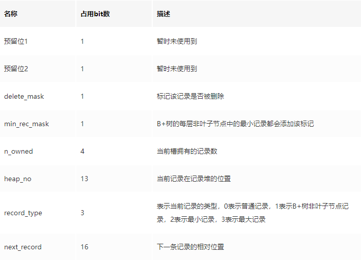 | roll_pointer | DB_ROLL_PTR | 是 | 7字节 | 回滚指针 |