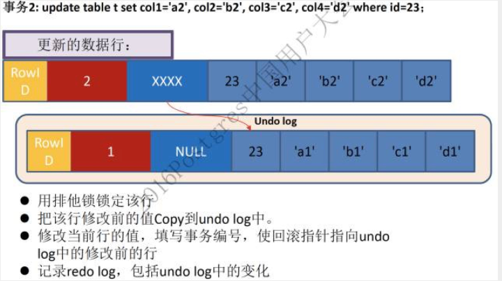 更新操作也会插入一条新纪录,保存当前系统版本号作为行版本号,同时保存当前系统版本号到原来的行作为删除标识