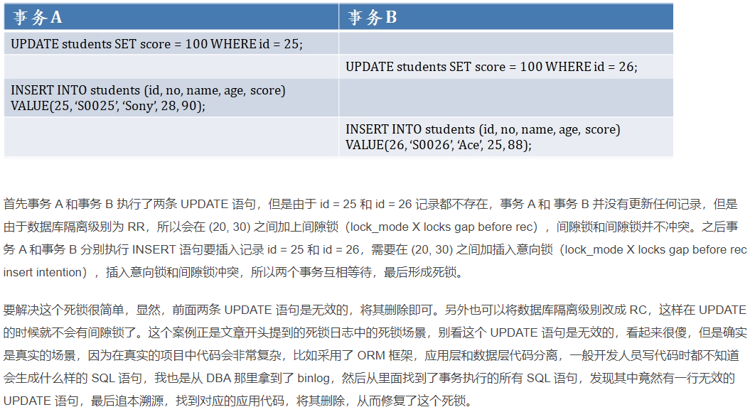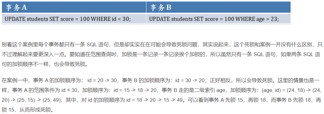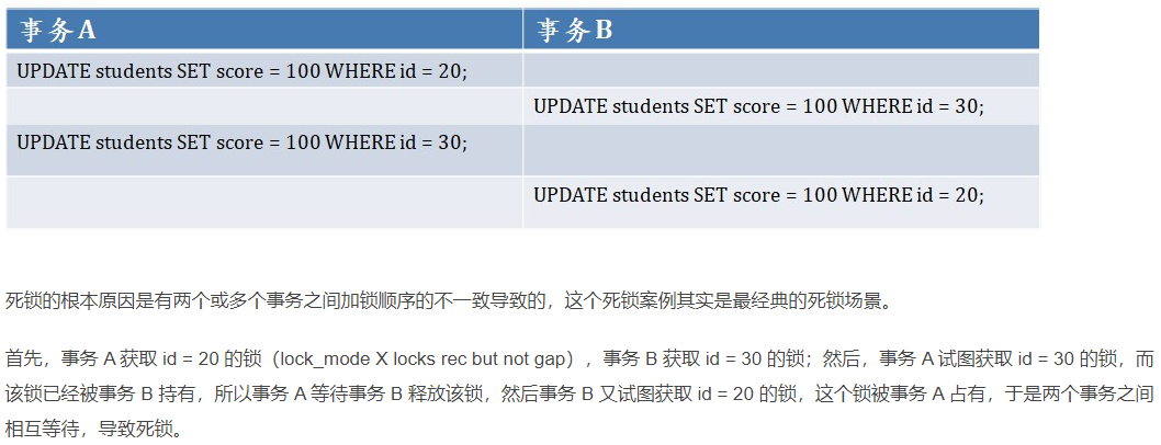 案例一和三中,对索引加锁顺序的不一致可能会导致死锁。所以我们应该尽量以相同的顺序来访问索引记录和表。