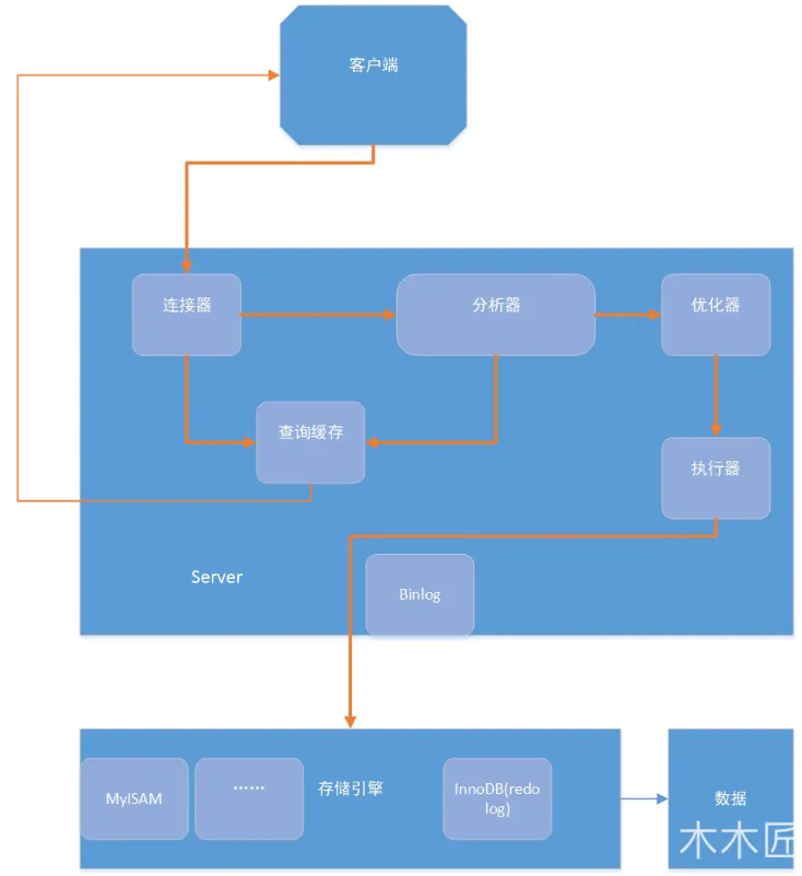 客户端发送一条查询语句,首先会经过连接器(它会完成与数据库的连接,并进行权限验证),如果没有权限那么就会直接返回错误信息;如果有权限,那么会先走缓存,看看缓存中是否有结果,没有的话才继续进行下一步