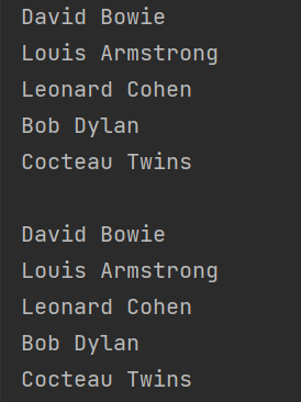name_list = ['david bowie', 'louis armstrong', 'leonard cohen', 'bob dylan', 'cocteau twins'] for name in name_list: print(name.title())