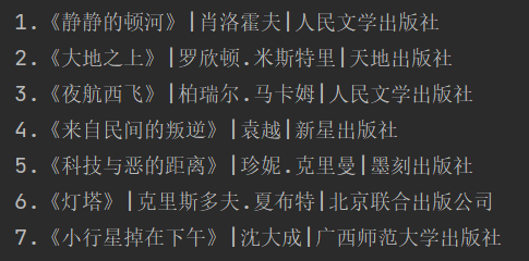 book_list = [['静静的顿河','肖洛霍夫','金人', '人民文学出版社'], ['大地之上','罗欣顿.米斯特里','张亦琦', '天地出版社'], ['夜航西飞', '柏瑞尔.马卡姆', '陶立夏', '人民文学出版社'], ['来自民间的叛逆', '袁越', '','新星出版社'], ['科技与恶的距离', '珍妮.克里曼', ' 詹蕎語', '墨刻出版社'], ['灯塔','克里斯多夫.夏布特','吕俊君','北京联合出版公司'], ['小行星掉在下午','沈大成', '', '广西师范大学出版社']] for index,book in enumerate(book_list): print(f'{index+1}.《{book[0]}》|{book[1]}|{book[3]}') print()