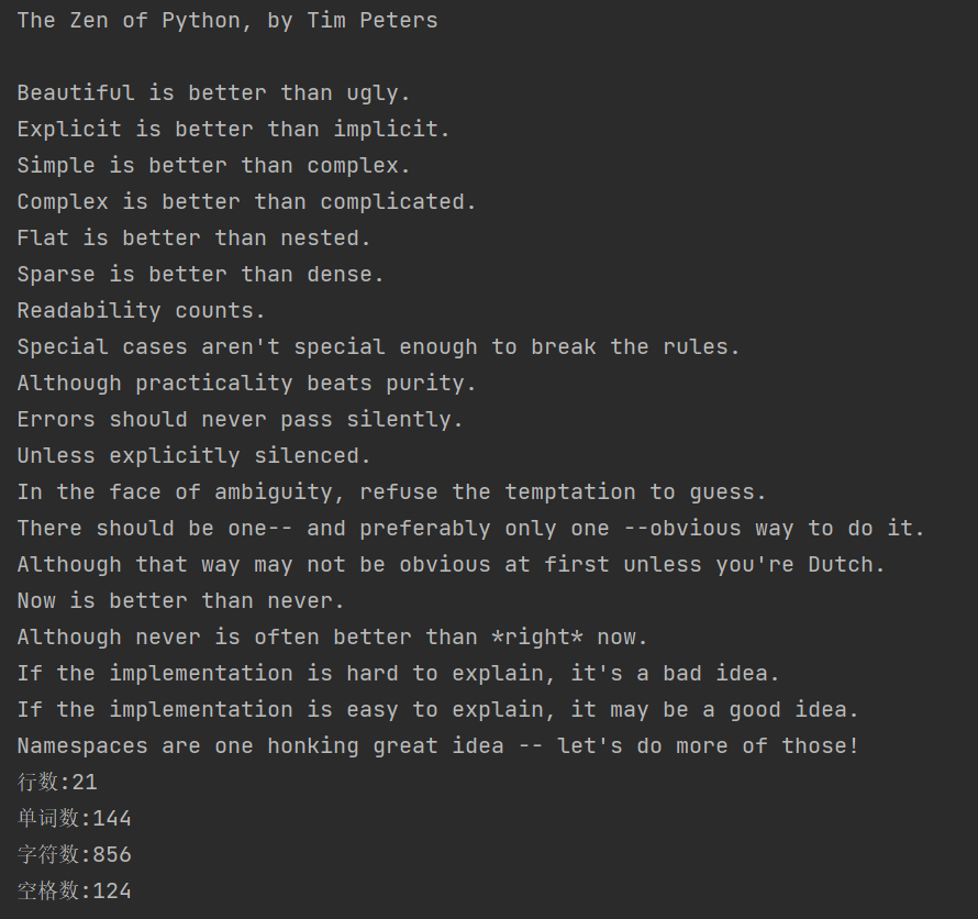 import this text = '''The Zen of Python, by Tim Peters Beautiful is better than ugly. Explicit is better than implicit. Simple is better than complex. Complex is better than complicated. Flat is better than nested. Sparse is better than dense. Readability counts. Special cases aren't special enough to break the rules. Although practicality beats purity. Errors should never pass silently. Unless explicitly silenced. In the face of ambiguity, refuse the temptation to guess. There should be one-- and preferably only one --obvious way to do it. Although that way may not be obvious at first unless you're Dutch. Now is better than never. Although never is often better than *right* now. If the implementation is hard to explain, it's a bad idea. If the implementation is easy to explain, it may be a good idea. Namespaces are one honking great idea -- let's do more of those!''' y = 0 x = 0 for i in text: if type(i) is str: y += 1 for n in text: if n == ' ': x += 1 print(f'''行数:{len(text.splitlines())} 单词数:{len(text.split())} 字符数:{y} 空格数:{x}''')