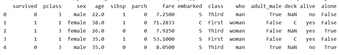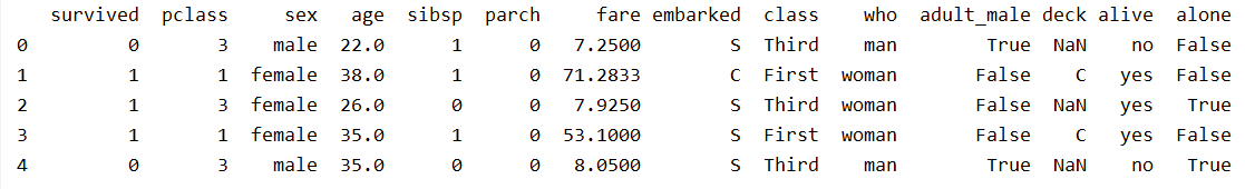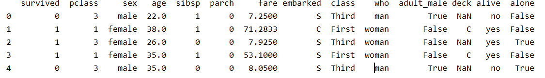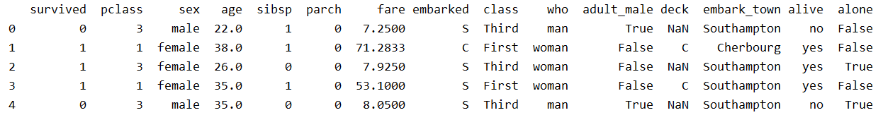 import pandas as pd pd.set_option('display.max_columns', 1000) pd.set_option('display.width', 1000) pd.set_option('display.max_colwidth', 1000) titanic = pd.DataFrame(pd.read_excel('titanic.xlsx')) titanic.head() titanic.drop('embark_town',axis=1,inplace=True) titanic.head() print(titanic.head())