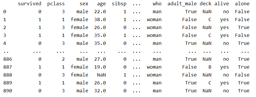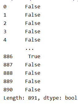import pandas as pd pd.set_option('display.max_columns', 1000) pd.set_option('display.width', 1000) pd.set_option('display.max_colwidth', 1000) titanic = pd.DataFrame(pd.read_excel('titanic.xlsx')) titanic.head() titanic.drop('embark_town',axis=1,inplace=True) titanic.head() titanic.duplicated() print(titanic.duplicated())