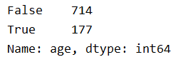 titanic = pd.DataFrame(pd.read_excel('titanic.xlsx')) titanic.head() titanic['age'].isnull().value_counts() print(titanic['age'].isnull().value_counts())