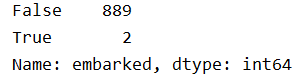 import pandas as pd titanic = pd.DataFrame(pd.read_excel('titanic.xlsx')) titanic.head() titanic['embarked'].isnull().value_counts() #查看embarked缺失 print(titanic['embarked'].isnull().value_counts())