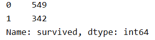 import pandas as pd titanic = pd.DataFrame(pd.read_excel('titanic.xlsx')) titanic.head() titanic['survived'].value_counts() print(titanic['survived'].value_counts())
