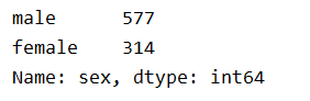 import pandas as pd titanic = pd.DataFrame(pd.read_excel('titanic.xlsx')) titanic.head() titanic['sex'].value_counts() #统计性别人数 print(titanic['sex'].value_counts())