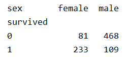 import pandas as pd titanic = pd.DataFrame(pd.read_excel('titanic.xlsx')) titanic.head() titanic.groupby('survived')['sex'].value_counts().unstack() # 统计获救男女人数 print(titanic.groupby('survived')['sex'].value_counts().unstack())