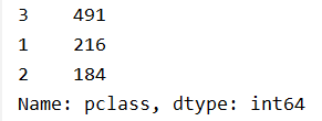 import pandas as pd titanic = pd.DataFrame(pd.read_excel('titanic.xlsx')) titanic.head() titanic['pclass'].value_counts() #统计乘客所在的船舱等级的人数 print(titanic['pclass'].value_counts())