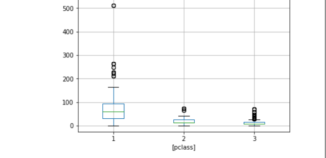 import pandas as pd titanic = pd.DataFrame(pd.read_excel('titanic.xlsx')) titanic.head() titanic.boxplot(['fare'],['pclass']) print(titanic.boxplot(['fare'],['pclass']))