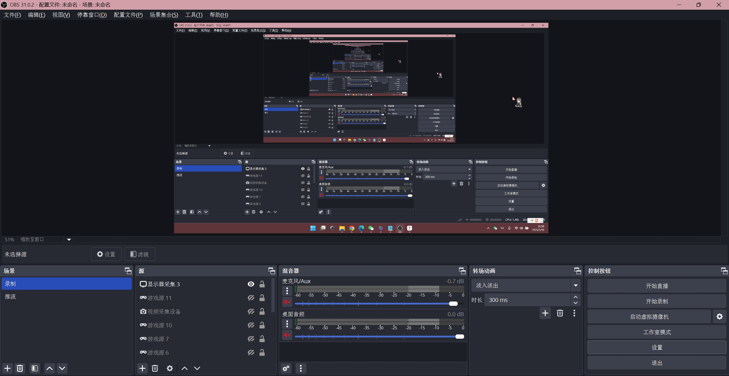 OBS拥有场景管理、源管理、音频管理、录制或推流、转场动画管理以及OBS设置等等功能。
