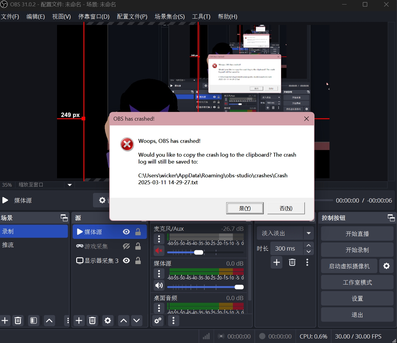 - 崩溃后,再次启动OBS,由于新建的媒体源还没有删除,OBS继续自动播放媒体源,然后继续崩溃。