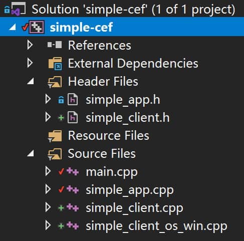 CEF的整体架构以及CefApp以及CefClient的概念可以参考该仓库里面的文档,或者是阅读官方文档。接下来将使用cefsimple代码进行解释说明,并适当增加一些小的细节。