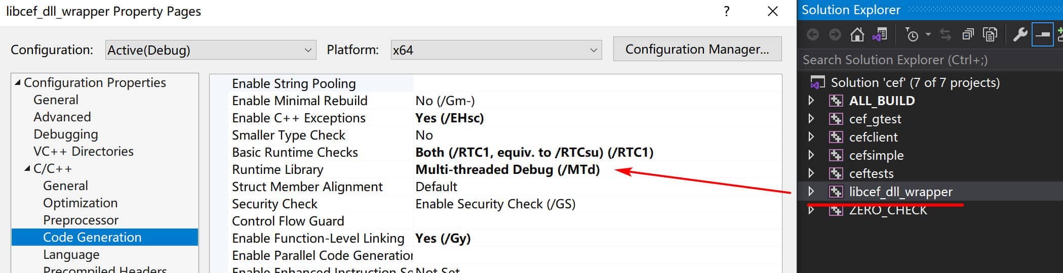 译为中文大意为:未检测到运行时库:MTd_StaticDebug无法匹配MDd_DynamicDebug,MTd是什么?MDd又是什么?关键字:MD、MDd、MT以及MTd。读者可以参考这篇文章深入了解:VS运行时 /MD、/MDd 和 /MT、/MTd之间的区别。简单一点讲,我们编译出来的libcef_dll_wrapper.lib库的某个标志与我们当前编译的程序的某个标志不一致:一个是MTd一个是MDd。那么这个标志在哪儿设置呢?我们可以右键项目工程——properties——C/C++——Code Generation(代码生成)——Runtime Library中看到。