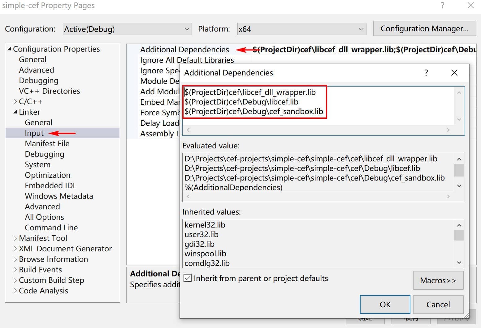 PS:这里本人使用了$(ProjectDir),它是一个VS宏变量,返回项目所在目录(即,vcxproj所在目录),且目录末尾带反斜杠\。从上面的Evaluated value里面展示的经过实际计算得到的值,可以验证我们配置是否正确。这里正确的返回了我们放在项目目录下的cef文件夹。