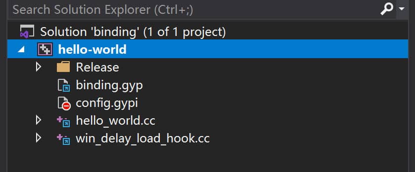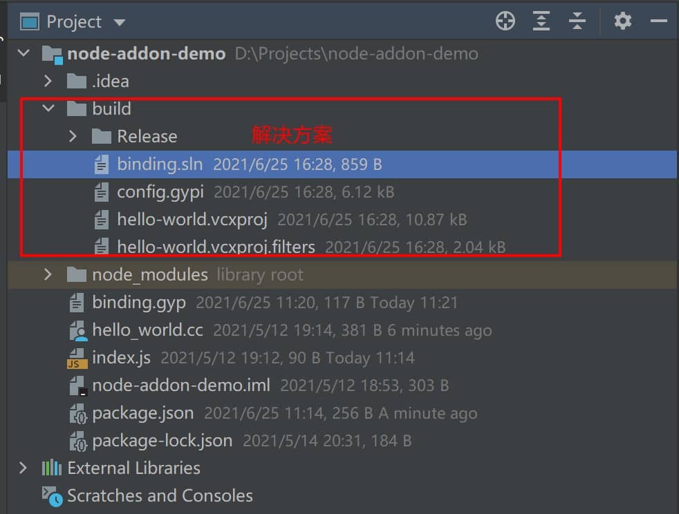 我们曾经讲过,node-gyp实际上只是构建工具,他会根据各个操作平台,生成对应平台的项目。在Windows上,它最终会帮你生成一个解决方案。查看项目目录下,我们就能看到一个build文件夹,这个文件夹下面会有解决方案: