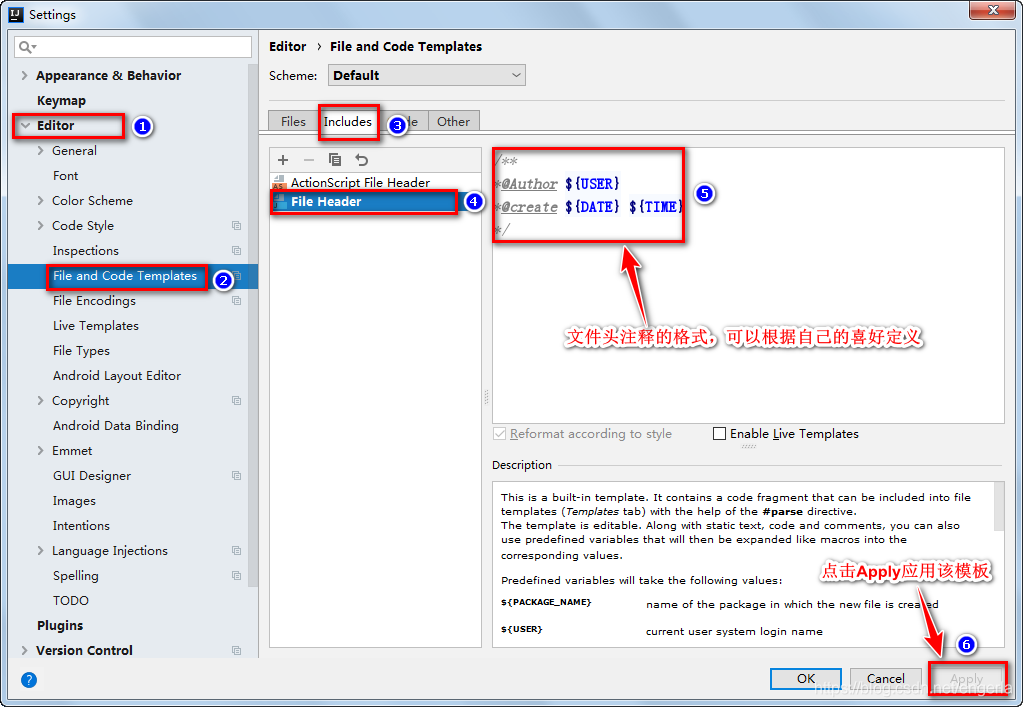 第二步、Editor -> File and Code Templates -> Includes -> File Header