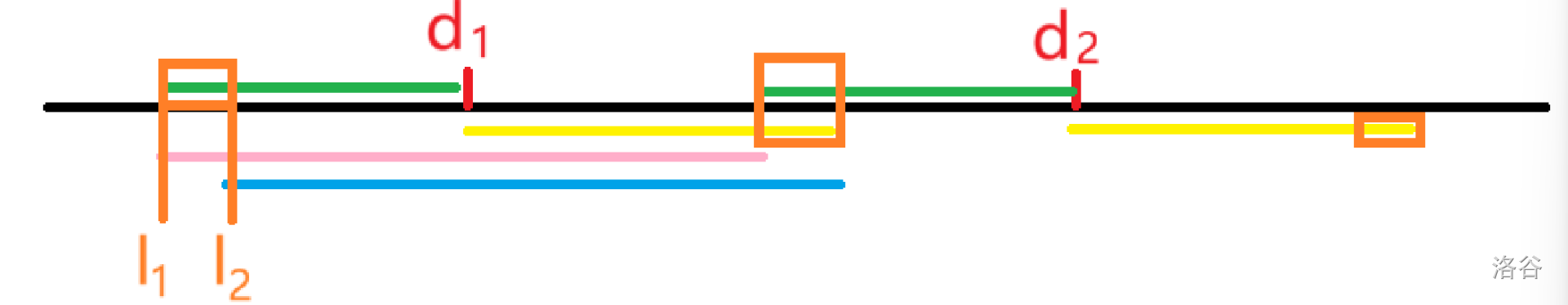 如图所示,\(d_1,d_2\) 表示分界点,绿色段表示第 \(i\) 段和第 \(i-1\) 的最长公共后缀,黄色段表示是第 \(i\) 段和第 \(i+1\) 的最长公共前缀,橙色框框表示完全相等的子段。此时,我们发现粉色段可以作为 \(AA\) 串中的 \(A\) 串,且一直滑动到蓝色段都可以作为 \(AA\) 串中的 \(A\) 串,于是 \(AA\) 串的左端点属于 \([l_1,l_2]\),进而可以算出右端点。考虑贡献,这相当于区间加 \(1\),差分后转化为单点修改,查询时一遍前缀和求出。