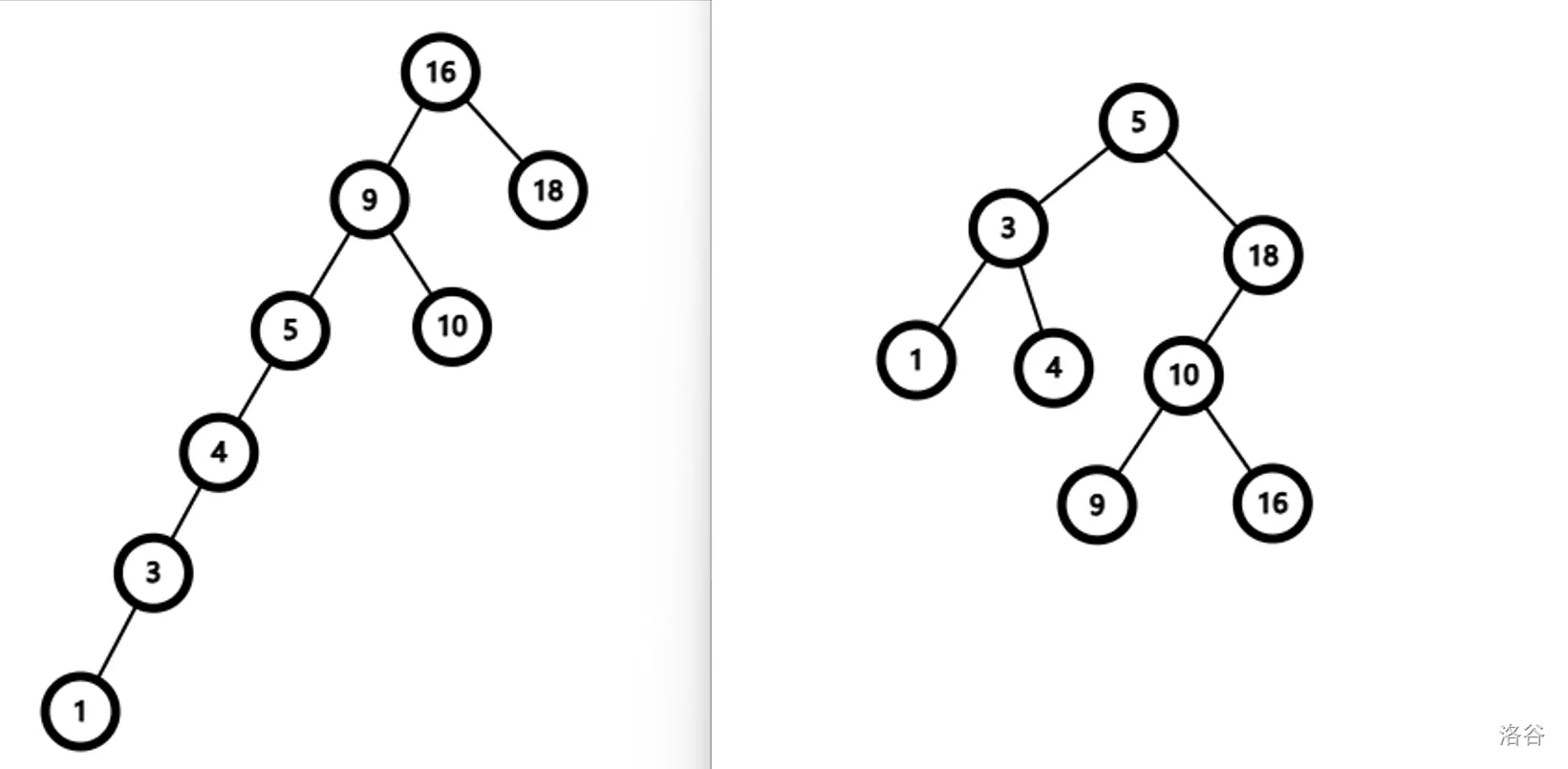 注意到同一棵二叉搜索树可以有不同的形态。例如,下面两张图片都是依次插入 \(1,3,4,5,9,10,16,18\) 的二叉搜索树。