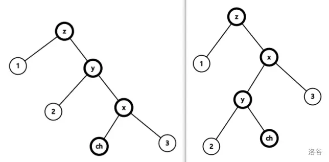 我们把图画出来,考虑旋转时节点关系的变化。