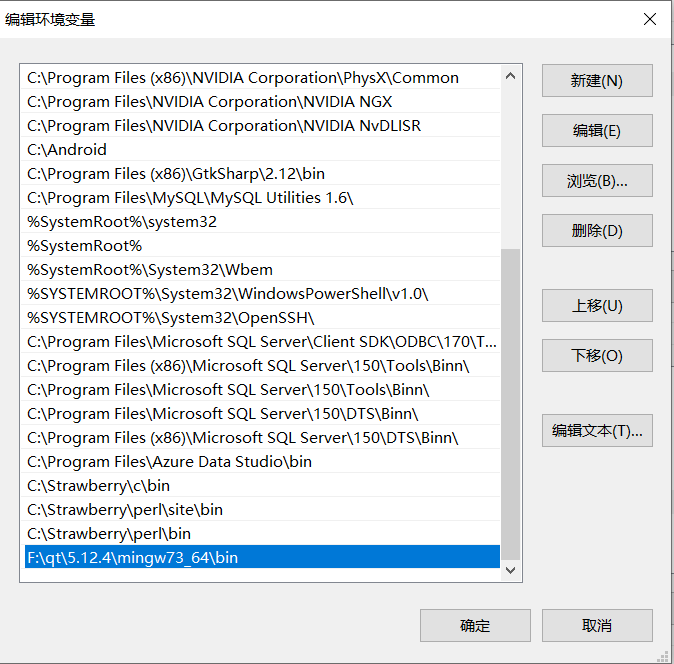 选择右方的新建,将windeployqt.exe所在的文件地址输入,我的文件地址为F:\qt\5.12.4\mingw73_64\bin