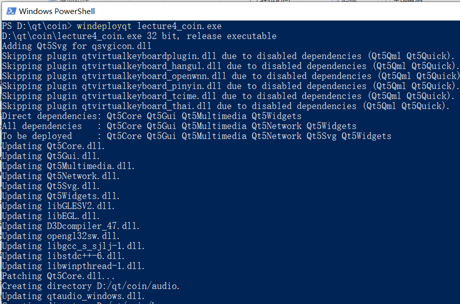 出现此问题的原因是没有将qt的windeployqt.exe路径放入系统环境变量,系统找不到此方法