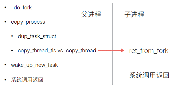 但fork系统调⽤在⼦进程当中也是返回的,也就是说fork系统调⽤在内核⾥⾯变成了⽗⼦两个进程,⽗进程正常fork系统调⽤返回到⽤户态,fork出来的⼦进程也要从内核⾥返回到⽤户态。
