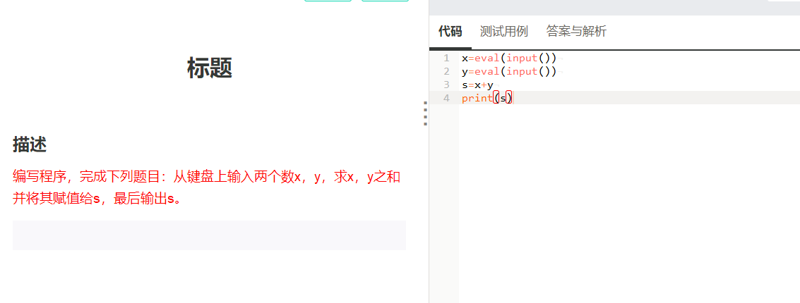 编写程序,从键盘上输入两个数x,y,求x,y之和并将其赋值给s,最后输出s。