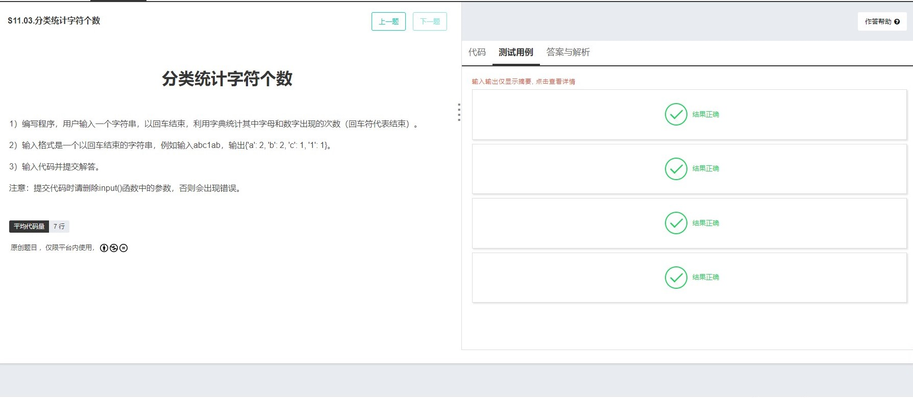 2)输入格式是一个以回车结束的字符串,例如输入abc1ab,输出{'a': 2, 'b': 2, 'c': 1, '1': 1}。