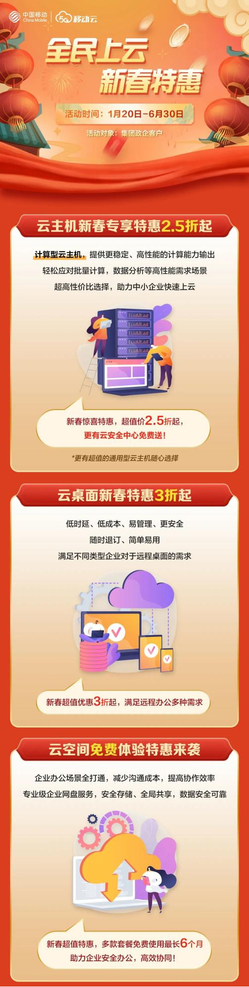耿直又财大气粗的移动云,特为各大客户送上开工大礼包:全民上云,新春特惠。