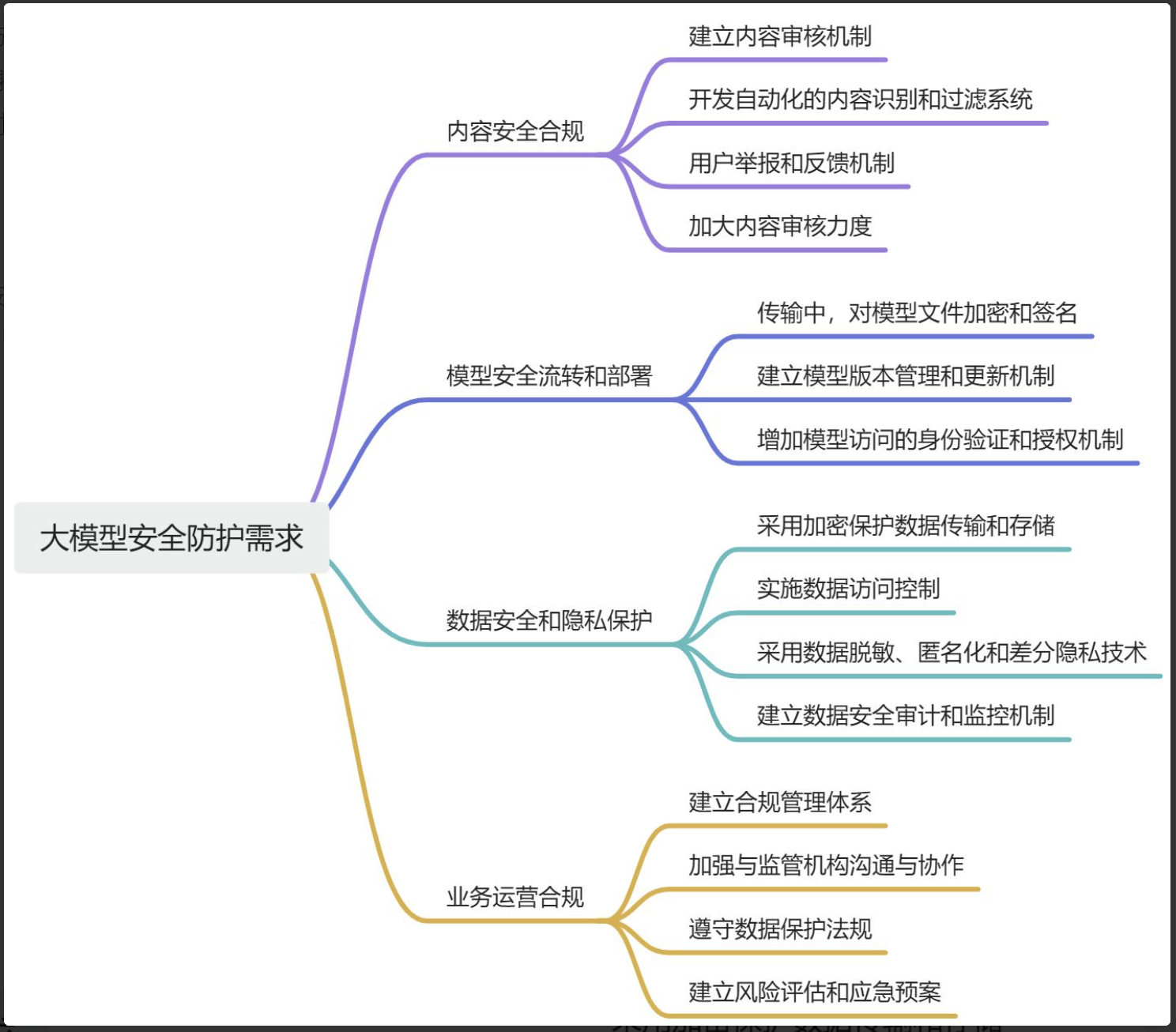 大模型的安全防护需求涉及内容安全合规、模型安全流转与部署、数据安全与隐私保护和业务运营合规4个方面,下面分别进行介绍。