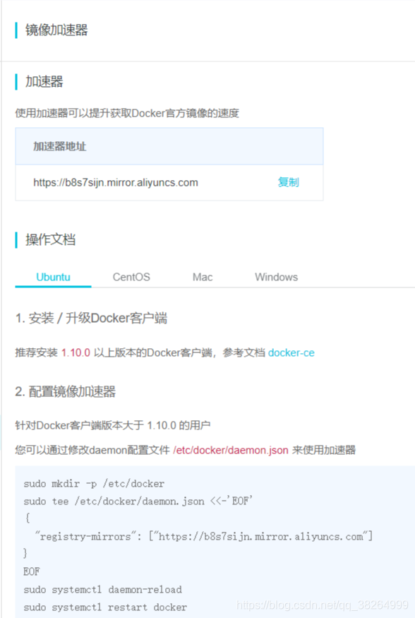 Docker客户端版本大于 1.10.0 的用户,您可以通过修改daemon配置文件/etc/docker/daemon.json来使用加速器