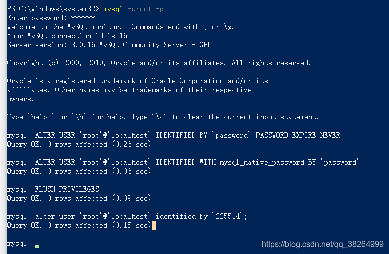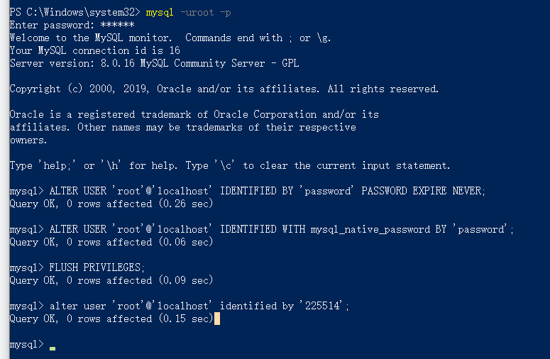 ALTER USER 'root'@'localhost' IDENTIFIED WITH mysql_native_password BY 'password';