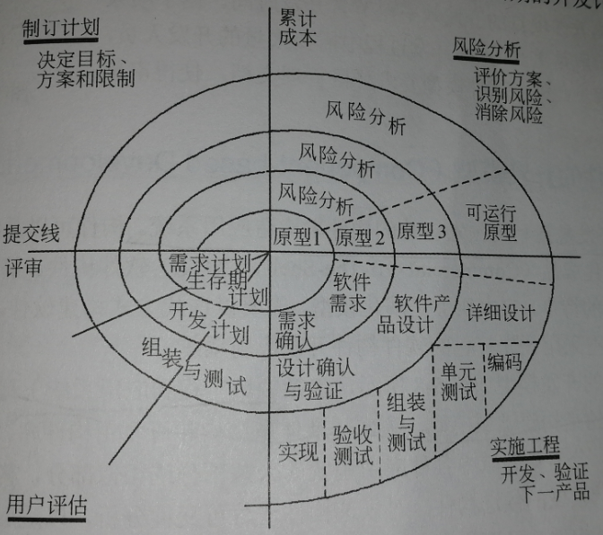 螺旋模型沿着螺旋线进行若干次迭代,图中的四个象限代表了一下活动: