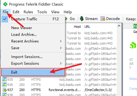 - Exit:取消把Fiddler注册为系统代理,并关闭Fiddler。