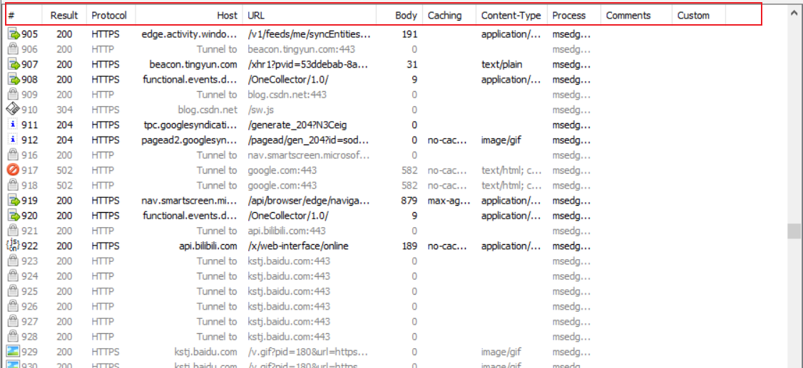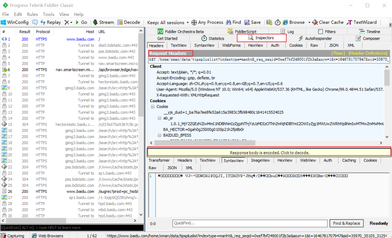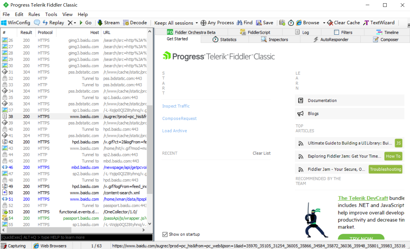 启动android设备中的浏览器访问百度首页或打开被测App,在fiddler中可以看到抓取到的数据报文了。