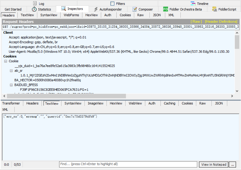 inspectors页签:它提供headers、textview、hexview,Raw等多种方式查看一条http请求的请求和响应,它分为上下两部分:上部分为请求展示,下部分为响应展示。