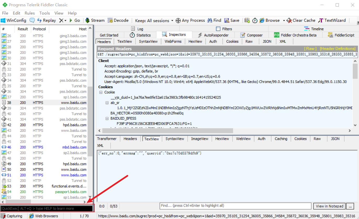 如果是刚打开Fiddler,会显示什么时间加载了CustomRules.js;如果选择了一个会话,会显示该会话的URL;如果在命令行输入一个命令,就会显示命令相关信息。