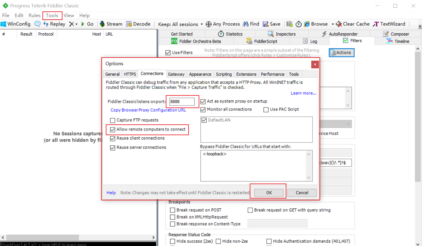 - Fiddler设置:菜单栏中选择tools->option,做如下两个设置: