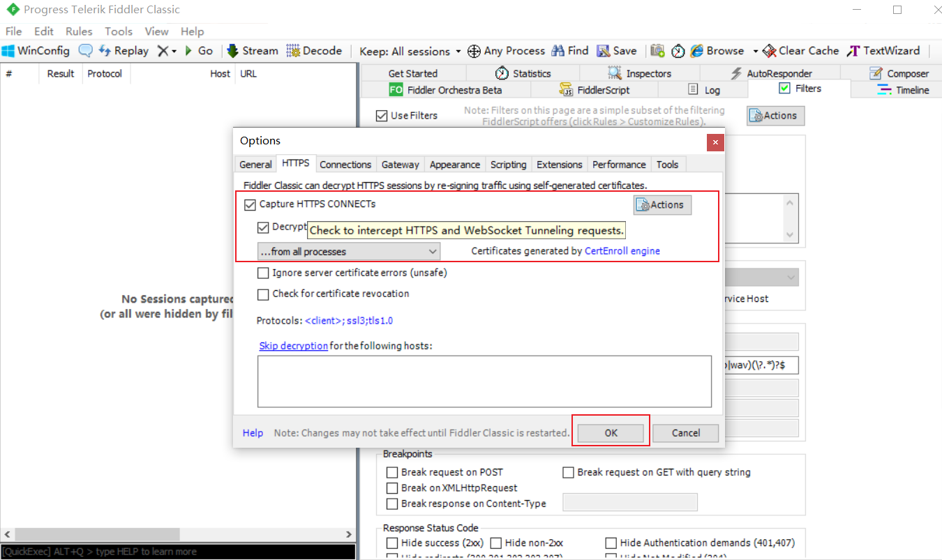 - Capture Traffic:可以控制是否把Fiddler注册为系统代理。